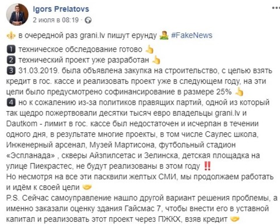 Очевидно, что ни правящие, ни Dautkom и grani.lv, владельцев которых депутат Прелатов не забыл обвинить в нехватке средств в Госкассе, на ситуацию повлиять не могли. Но из нашей Думы, похоже, все выглядит иначе, даже вполне очевидные вещи… А первому вице-мэру, видимо, пора хэштэг #FakeNews ставить напротив своей фамилии.