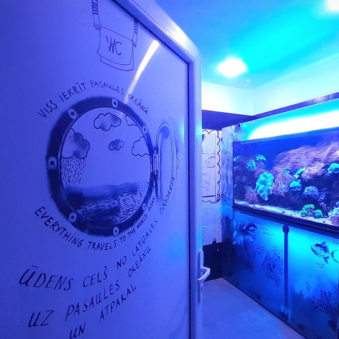 В Латгальском зоосаде стала доступна очень необычная уборная - здесь можно не просто воспользоваться туалетом, но и полюбоваться на большой красивый аквариум и стенную роспись, которую создала художница Инара Петрусевич.