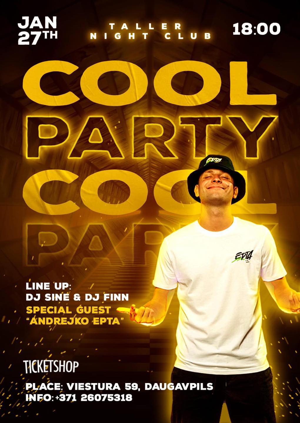 27 января (пятница) в 19:00, в Taller (ул. Виестура, 59, Даугавпилс) вас ждет крутая вечеринка с DJ Sine DJ Finn. Специальный гость - Андрей, известный под именем Андрейка Епта.
