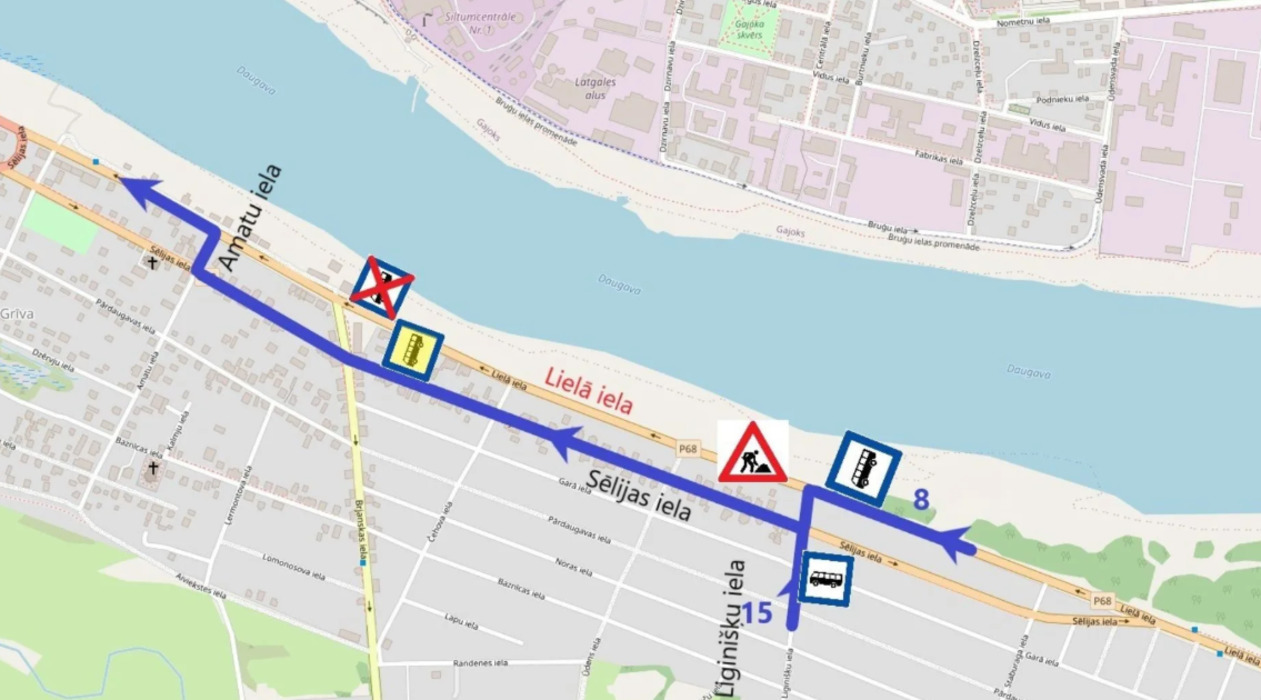Указанные автобусные маршруты с Юдовки и Лигинишек до автовокзала по обычному расписанию будут курсировать до остановки “Liginišķu iela”, далее автобусы будут следовать по улицам Лигинишкю, Селияс, Амату и далее снова по обычной схеме.