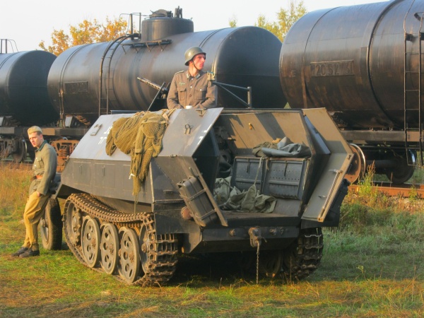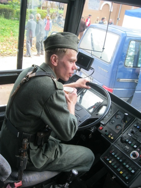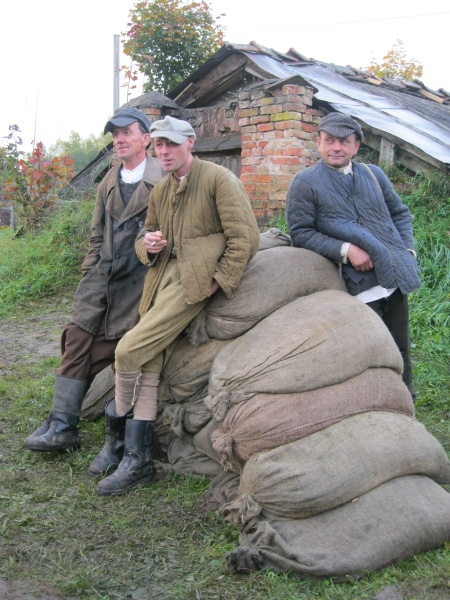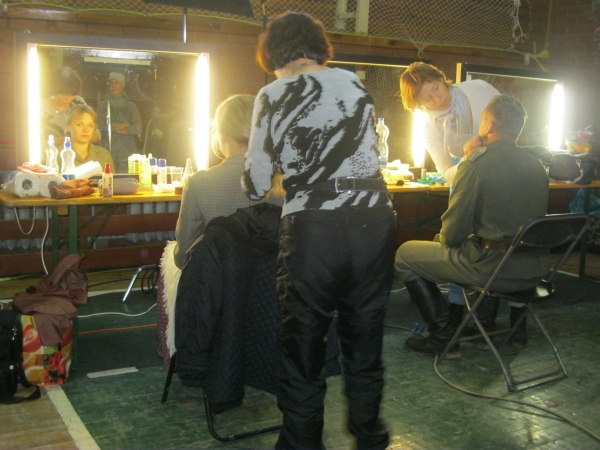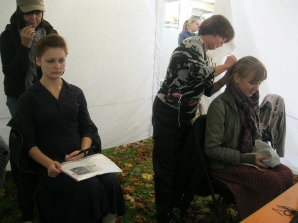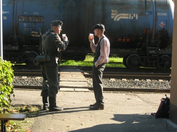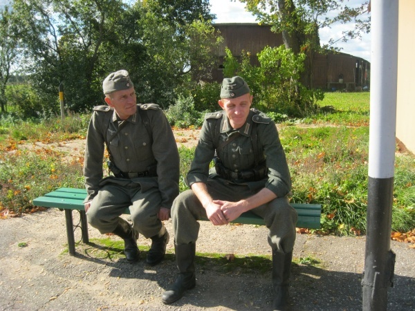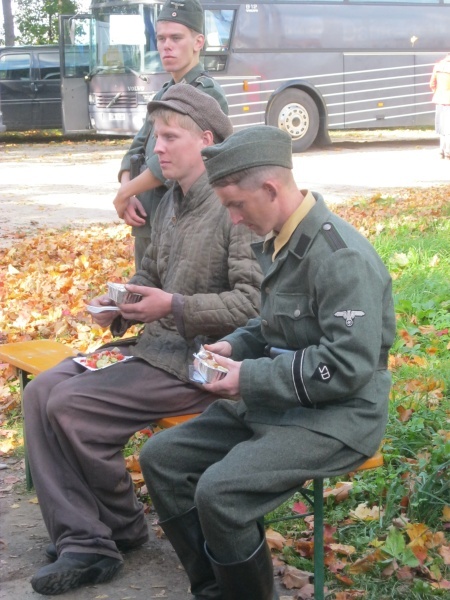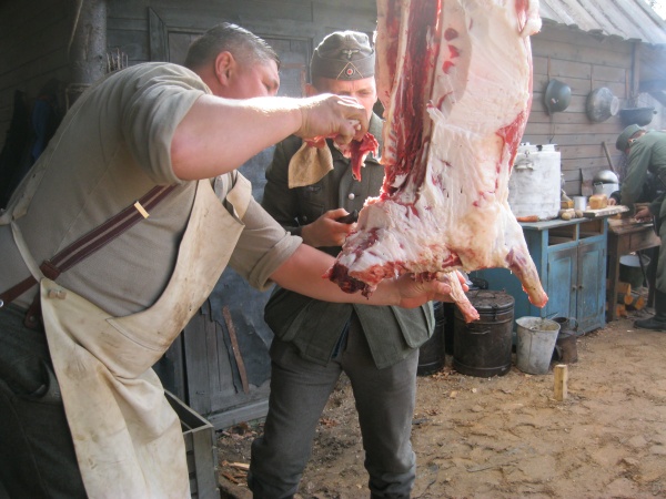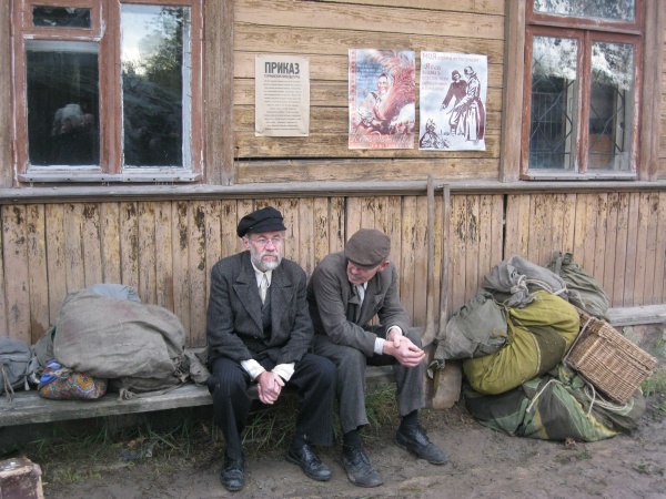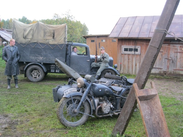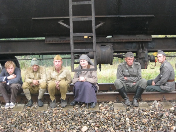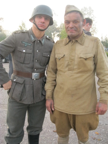 Первые часы ожидания нас увлекало наблюдение со стороны за съемками двух эпизодов, в которых мы не принимали участие. Затем, во время обеденного перерыва удалось устроить фотосессию с ребятами в форме солдат Вермахта. Тогда мы и поинтересовались – в чём заключается их задача? Если кто-то считает, что съемки в массовке – это сплошное действо, то он сильно ошибается. Съемки в массовке, да и в более значительных ролях, - это долгие часы репетиций, повторение одних и тех же действий, после чего следуют несколько дублей, пока режиссёр не снимет нужную ему картинку. Как рассказал Дмитрий, играющий роль немецкого солдата, его задача заключалось в том, чтобы во время съемок эпизода на фоне разворачивающихся событий мыть машину. Так он и полировал на протяжении нескольких часов съемок авто. Со стороны это может показаться довольно нудным занятием, но не когда ты лично задействован в сюжете. Или ещё один пример, пожилому мужчине во время съемок нужно было носить дрова. Несмотря на то, что за время репетиций и непосредственно самих дублей по его словам он перенес столько дров, что они могли бы вместиться в две машины, от усталости на его лице не было ни следа.