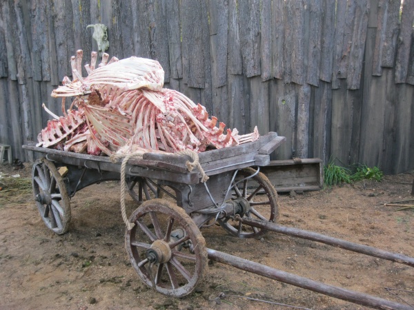Дом, стоящий на пригорке, стал декорацией вокзала, на другом здании были водружёны флаги Третьего рейха, обозначив таким образом месторасположение гестапо. Хочется отметить, что большим удивлением для меня стало реалистичность оформления декораций – и груда костей, размещённая на телеге, и туши двух баранов – всё это было настоящим. Я уже не говорю о яблоках, которые продавались на рынке, каше, которую должны были требовать дети во время съемок у повара, мешке семечек, быстро разошедшемся по карманам детворы, и, конечно, настоящей военной технике тех времён.