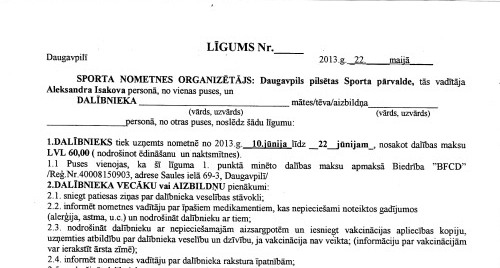 «Так почему же тогда в договоре указывается, что за нас это делает кто-то другой, если платим мы?» - не найдя ответа у спортивных чиновников, читатель и решил выяснить вопрос с помощью журналистов. «Когда мы, несколько родителей, стали выяснять этот вопрос, то нам было сказано, что по 60 латов за путевку платят родители всех воспитанников спортшколы, что касается футболистов, то доплата в 20 латов – это добровольная инициатива BFCD, призванная помочь родителям юных футболистов».