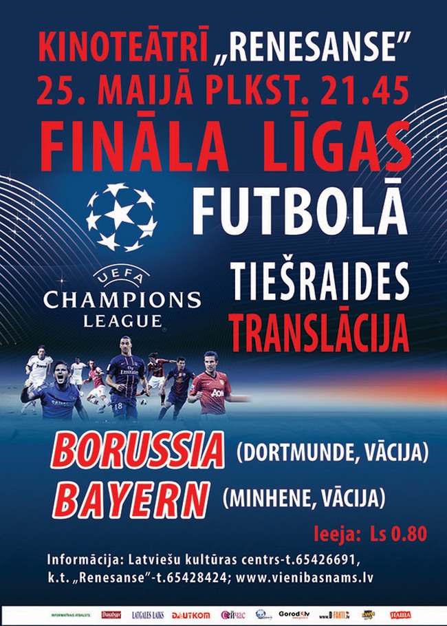 25 мая в 21:45 по латвийскому времени начнётся финальный матч, в котором определится новый обладатель кубка Лиги чемпионов УЕФА 2012/2013. Впервые в истории путёвку в финал завоевали два немецких клуба – мюнхенская «Бавария» и дортмундская «Боруссия». Чтобы стать свидетелями этого грандиозного матча, даугавпилсским поклонникам футбола необязательно отправляться в Лондон. Трансляция игры в прямом эфире будет организована в кинотеатре «Ренессанс».