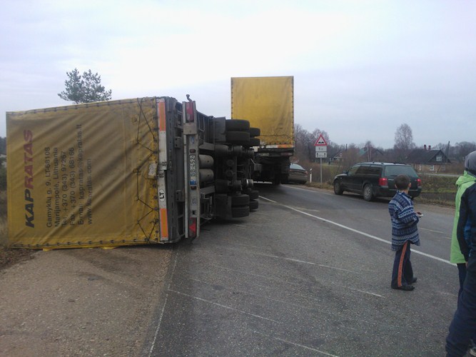 В воскресенье, 10 ноября, на полдня было заблокировано движение на участке дороги А-14 в Свенте. Водитель фуры Renault Magnum не справился с управлением, в результате чего прицеп завалился на бок.