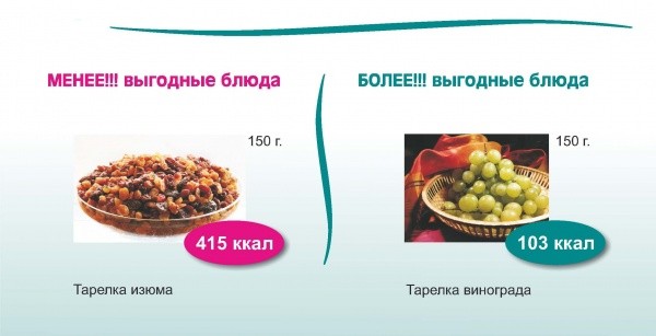И вновь история клиентки, которая, посетила тренинг по нормализации пищевого поведения и уже имела представление о более и менее выгодных продуктах питания и блюдах. А на консультацию пришла с двумя проблемами: «не наедаюсь» и «вес не уходит, хотя делаю всё!» Изучение дневника питания показало, что питание в общем и целом соответствует тем рекомендациям, о которых говорилось на тренинге. А в подробной беседе клиентка ненароком упомянула о том, что десертом для неё является изюм, которым она заменила привычные кондитерские сладости. «Да и съедаю-то я всего одну-две горсти», – сказала клиентка. Она была искренне убеждена, что калорий в изюме минимум. Вывод прост: записывайте всё, что съедаете!