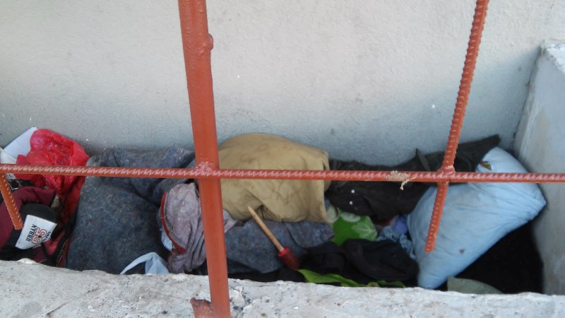 Сегодня утром мы констатировали, что «окна» решеток стали в два-четыре раза меньше благодаря приваренным дополнительным металлическим прутам. А вот свои вещи бомжи отсюда так и не забрали. Как бы то ни было, теперь им придется искать другое пристанище, и хорошо бы им, наконец, обратиться в муниципальную ночлежку: здесь и тепло, и кровати нормальные, и супом кормят, и помыться можно. Ну а спать в бетонных приямках, даже накрывшись несколькими старыми одеялами, когда ночью на улице мороз, все равно не дело.