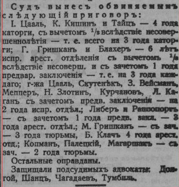 Подсудимых защищали четыре адвоката, благодаря им некоторых удалось оправдать. Но большинство получило сроки наказания. Суд приговорил их на сроки от 1 года до 4 лет каторги (см. фотоскан).