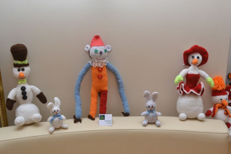 Нынешняя выставка посвящается зимним праздникам, поэтому на ней много вязаных елочных игрушек, забавных обезьянок из разных материалов, картин на соответствующие сюжеты и т. д. Например, Лариса Сергеева выставила свои живописные работы, иллюстрирующие сказки – «Снежную королеву», «Морозко» и другие.