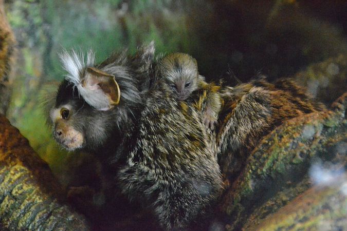 Пока же детеныш крепко держится за шерсть своего родителя, который ревниво оберегает его от посторонних глаз. Между прочим, мармозетки смотрят обычно за своими детьми все вместе, налаживая таким образом прочный социальный контакт. Кроме того, мармозетки всеядные: любят бананы, груши, яблоки, часто грызут кору деревьев и слизывают появившийся сок, а также ловят насекомых, в частности тараканов. Между прочим, мармозетки Латгальского зоосада очень любят лакомиться йогуртом.