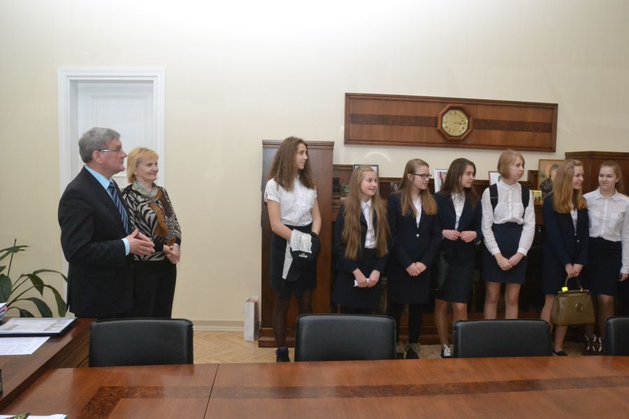 Галерея градоначальников, расположенная перед залом заседаний, впечатлила лицеистов, которые, в свою очередь, порадовали экскурсовода хорошими знаниями городской истории, а среди портретов почетных даугавпилчан школьники с радостью находили знакомые лица. Например, бывшего директора лицея Е. Тимошенко.