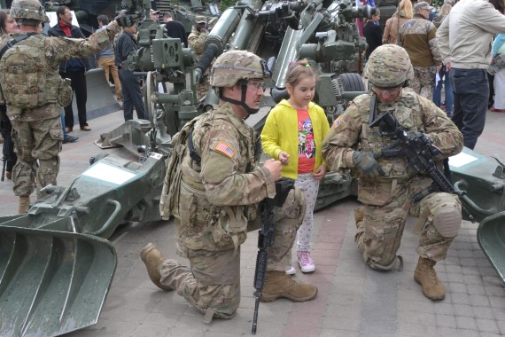 Далеко не жаркая погода и накрапывающий дождь не помешали детям и взрослым с удовольствием позировать на фоне знаменитых американских бронированных машин Stryker, залезая на самый верх, а также почувствовать себя членами команды, посидев еще и внутри. Стоящие возле каждой боевой машины военнослужащие готовы были ответить на любой заданный вопрос, правда, только по-английски, поэтому большинство зрителей предпочитали скорее смотреть, чем разговаривать.