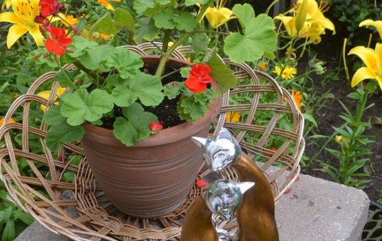 На их большом участке нет огорода, размещена только теплица да несколько грядок с огурцами, основанная территория – это газон и декоративные растения – в основной своей массе декоративные кустарники и деревья. Недалеко от дома красуется большая клумба в виде корзины с цветами, а вдоль дома расположились розы.