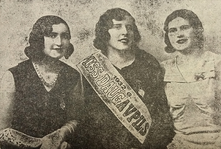 На фото: В 1932 году в городе свыбирали мисс Даугавпилс и ее фрейлин. Победила 17-летняя Э. Лабудзь, явившаяся на конкурс «почти Золушкой: ее лицо было свободно от косметики, вьющиеся русые волосы спутаны ковбойской шляпой, а бубикопф (короткая стрижка) был сзади срезан, как будто собственноручно. Все это ей не только не повредило, но наоборот, послужило на пользу. Победу девушке принесла ее молодость, свежесть, непосредственность, бойкость и задор. М-ль Г. Окунь досталось звание первой фрейлины, а м-ль Ф. Рогозиной – второй».