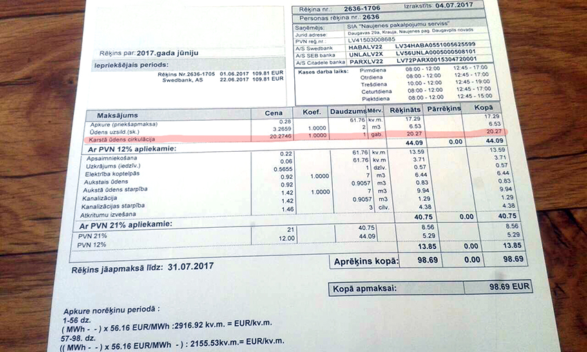 Жительница дома на ул. 18 Новембра, 394, Инга поясняет: «Плата за циркуляцию воды уже второй месяц доходит до 20 евро с квартиры. Обращались к руководству NPS в июле. Обещали, что проблема будет решаться. Но в августе счета не уменьшились. Просим вас помочь нам решить эту проблему, так как и без этого у нас в поселке много проблем. Состояние дорог, тротуаров в плачевном состоянии. Складывается впечатление, что NPS только взимает плату за услуги, и на этом всё. Нет сил терпеть эту бесхозяйственность. Куда уходят наши деньги? Мы очень хотим, чтобы был проведен тщательный разбор этих проблем».