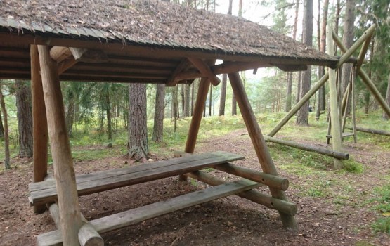 Проезжая мимо следующей излучины - Butišķu loks в одном месте, практически напротив парка "Stalkers" реку видно с дороги. Тут-то мы и высмотрели, что на противоположном берегу высоко в лесу стоит деревянная беседка.