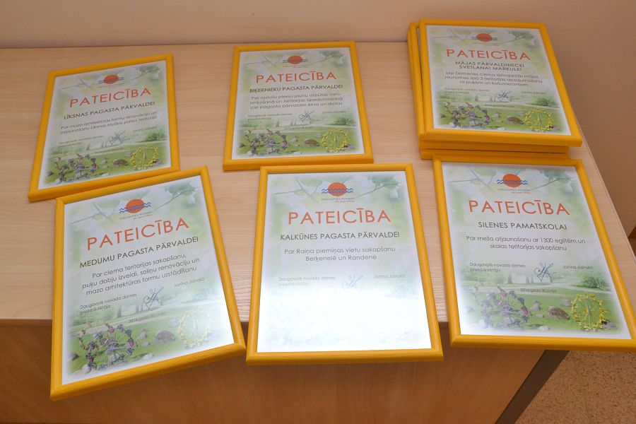 Памятные дипломы и приятные сувениры получили: Ликсненская волость – за реновацию малых архитектурных форм, Медумская – за уборку и озеленение территории, Калкунская – за благоустройство памятных мест Райниса в Рандене, Малиновская – за творческий подход и необычное решение дизайнерских деталей, Силенская – за посадку целого елового бора из 1 300 маленьких елочек, Свентская – за популяризацию Sudmaļu pilskalns, а жительница Деменской волости Светлана Маркуль – за озеленение территории у многоквартирного дома.