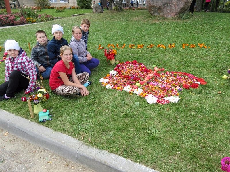 Учащиеся проявили фантазию, изготавливая композиции из принесенных из дома овощей, фруктов и цветов. Каждый класс выкладывал на траве в школьном дворе самые разные картины: здесь были и порхающие бабочки из астр, георгин и хризантем, и фантастические птицы, и ежики из цветной капусты, и латышские национальные узоры, и солнце из бархатцев.