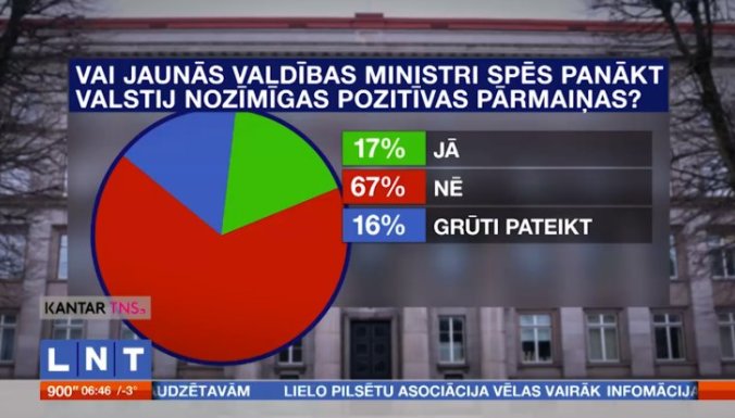 В ходе опроса 67% респондентов в возрасте от 18 до 60 лет заявили, что не верят в улучшение ситуации в Латвии при новом правительстве. Доверие нынешним и будущим действиям министров Кариньша выразили лишь 17% опрошенных, и почти столько же (16%) ответили, что затрудняются с ответом.