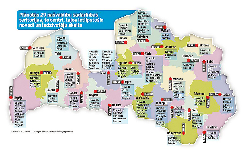 Ранее сообщалось, что Министерство охраны окружающей среды и регионального развития подготовило проект создания в Латвии всего 16 уездов с центрами в городах и важнейших краевых центрах — вместо теперешних 119 муниципалитетов.