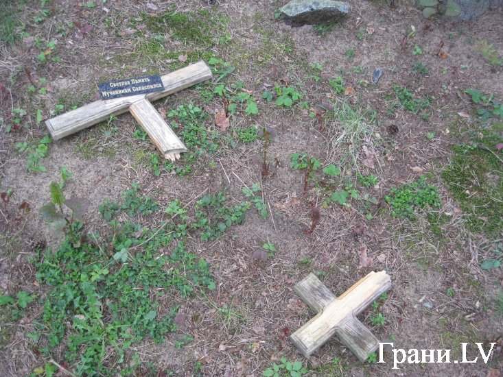 Православный крест с надписью «Светлая память мученикам Саласпилса» выдернут из могильной насыпи и разломан на части. Могила, где перезахоронены останки нескольких погибших, растоптана, цветы вырваны, вазы и стеклянные подсвечники разбиты. Повален на землю могильный камень начала XX века, а невдалеке валяется притащенная из ближней мусорной кучи автомобильная покрышка.