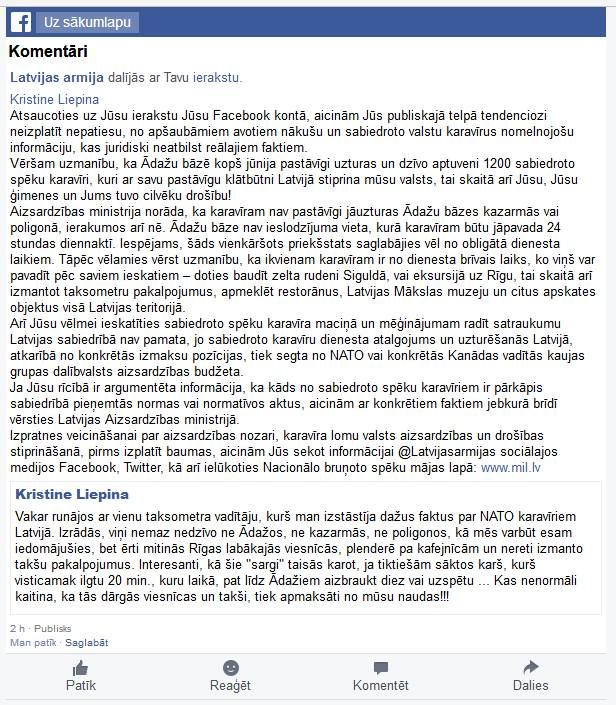 В частности НВС обратились через соцсеть Facebook к жительнице Латвии Кристине Лиепине, написавшей в Facebook о том, что военнослужащие НАТО, расквартированные в Латвии, живут не в казармах в Адажи, а в элитных гостиницах Риги. Оборонное ведомство посоветовало ей прежде чем публиковать подобные материалы, проверить факты, а не полагаться на слухи и домыслы.