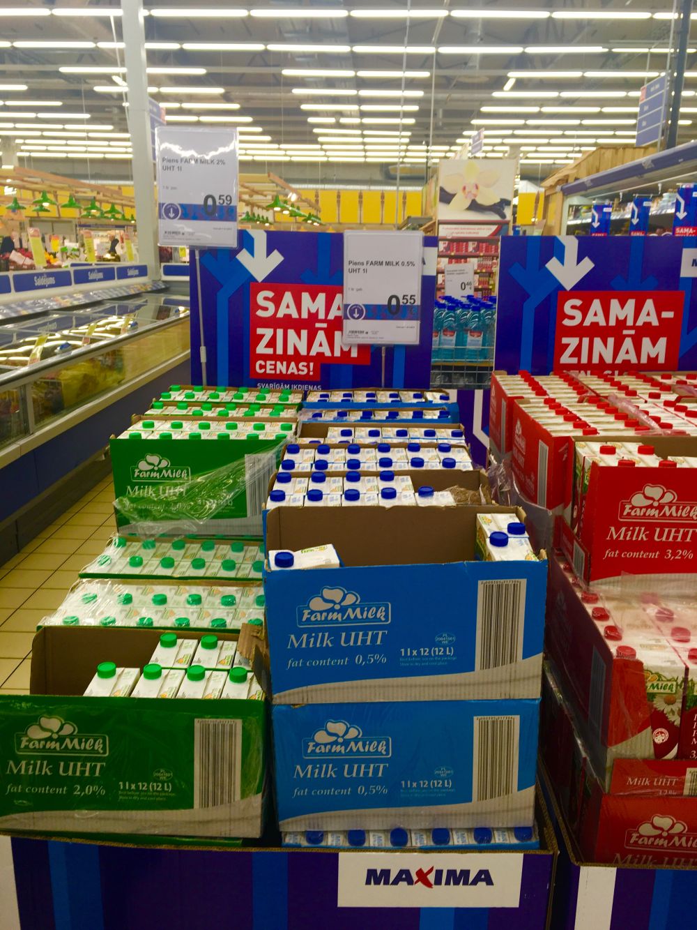 - Литровая пачка молока Farm Milk (0,5%, UHT) по цене 0, 55 евро, прежняя цена — 0,82 евро.