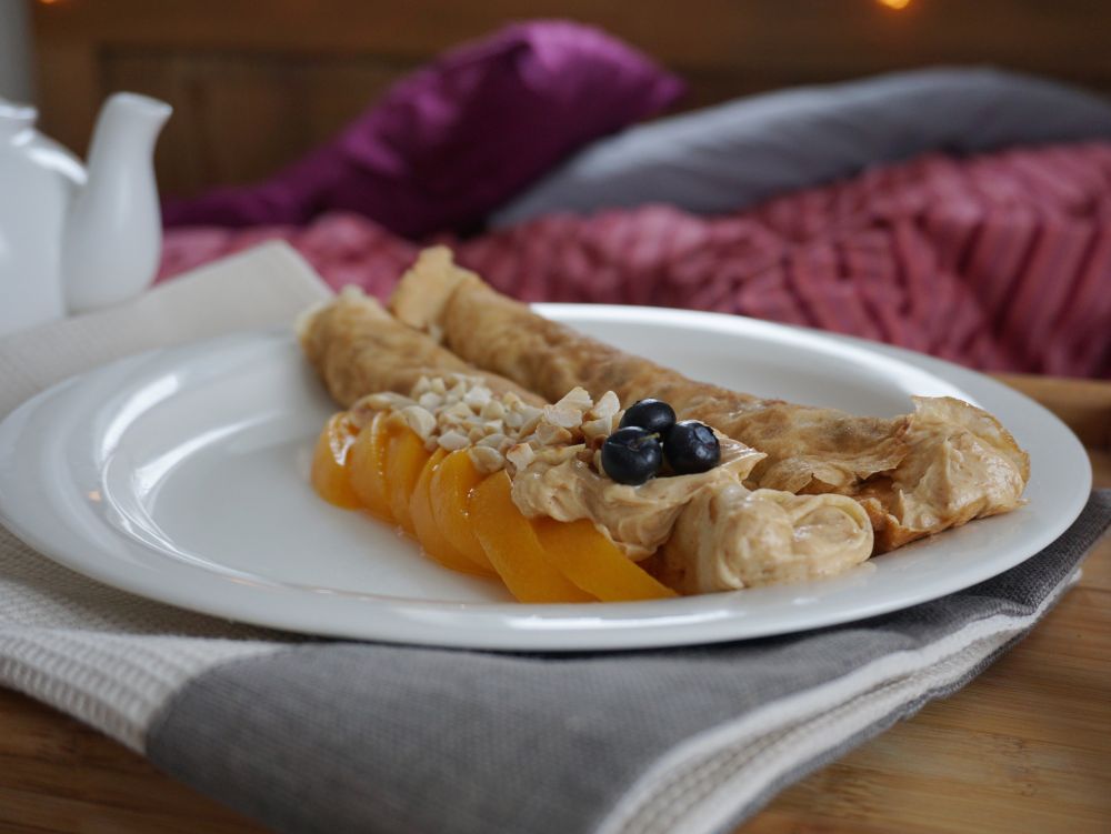 3. Блины свернуть и подавать с измельченным арахисом и кусочками консервированного персика.
