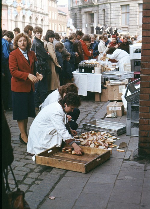 На этой картинке мы видим, как в самом центре Риги праздничные люди стоят в очереди к лотку выездной торговли. Заплатив обычную ресторанную цену, каждый человек может угостить себя бутылочкой пепси-колы и бутербродом с колбасой. Все-таки праздник – можно себе не отказывать. К сожалению, формат снимка не позволяет показать длину очереди. По памяти могу сказать: не менее полутора-двух часов ожидания. И – ничего страшного: очередь была самой заурядной формой существования советского человека, значительный кусок отведенного каждому срока (после сна и работы) мы проводили в очередях.