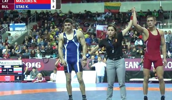 В четвертьфинале Никите противостоял болгарин украинского происхождения Константин Стас. Никита снова оказался в роли догоняющего – 0:2, но сумел выйти вперед (3:2). За минуту и 5 секунд до окончания поединка – 4:4 с преимуществом даугавпилчанина. За 21 секунду до окончания схватки болгарская сторона подала протест, который не был удовлетворен, и Масюк повел – 5:4. До окончания поединка счет так и не поменялся.
