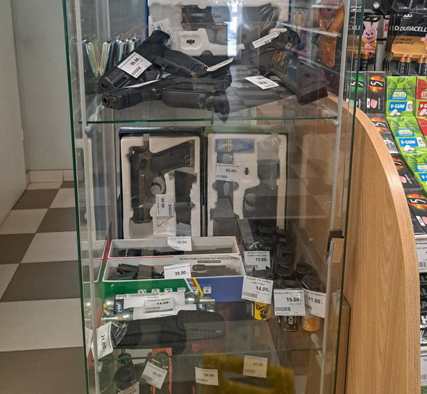 Пневматические пистолеты стоимостью от 39 до 100 евро может купить любой желающий при предъявлении паспорта, перцовые баллончики – на любой вкус и цвет, электрошокеры. На этой автозаправочной станции мне приходится бывать раз в месяц, но подобного видеть здесь раньше еще не доводилось.