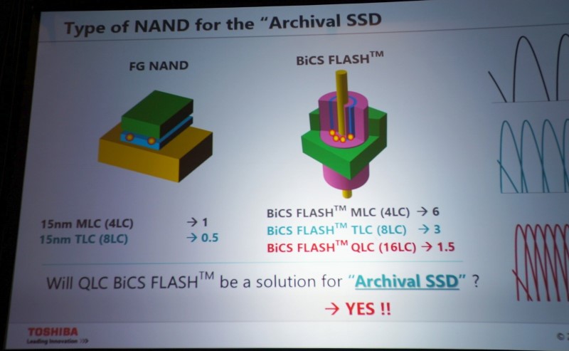 Учитывая тенденцию снижения стоимости хранения данных на жёстких дисках и на разных типах памяти, в компании Toshiba уверены, что со временем хранение данных на SSD будет стоить дешевле, чем на HDD. Выше вы можете видеть график, из которого следует общая выгода хранения данных на твёрдотельных накопителях. Сопутствующие затраты в пересчёте на объём SSD и HDD просто несравнимы. В совокупной стоимости владения на долю ёмкости HDD приходится порядка 25 % вложений, тогда как в случае SSD — более 75 %. Безусловно, в ближайшем будущем — до 2020 года — SSD не смогут заменить жёсткие диски во всём спектре применения, но 3D NAND и четырёхбитовая ячейка обещают открыть путь к недорогим и ёмким SSD для хранения архивных данных.