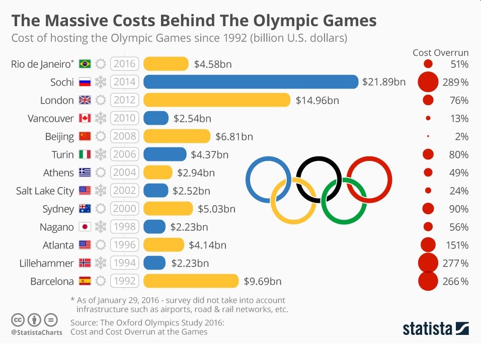 Наибольшая сумма перерасходов была зафиксирована на зимней Олимпиаде в Сочи в 2014 году – 289% при бюджете в 21,89 млрд. Этот рекорд превзошел даже соревнования в Лиллехаммере (1994 – 277%) и Барселоне (1992 - 266%), хотя по суммарному бюджету обставил абсолютно все предыдущие Олимпиады.